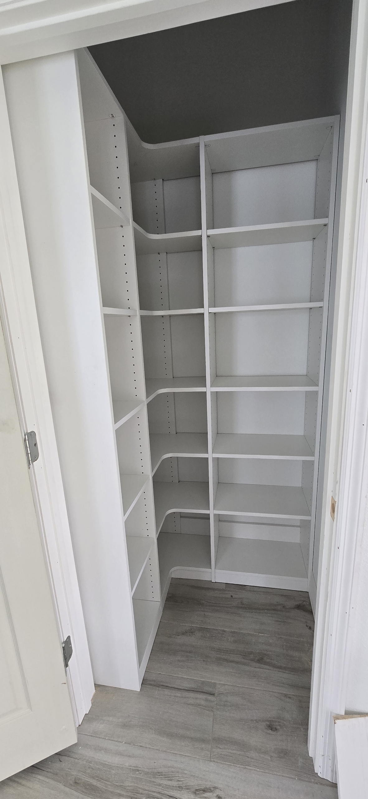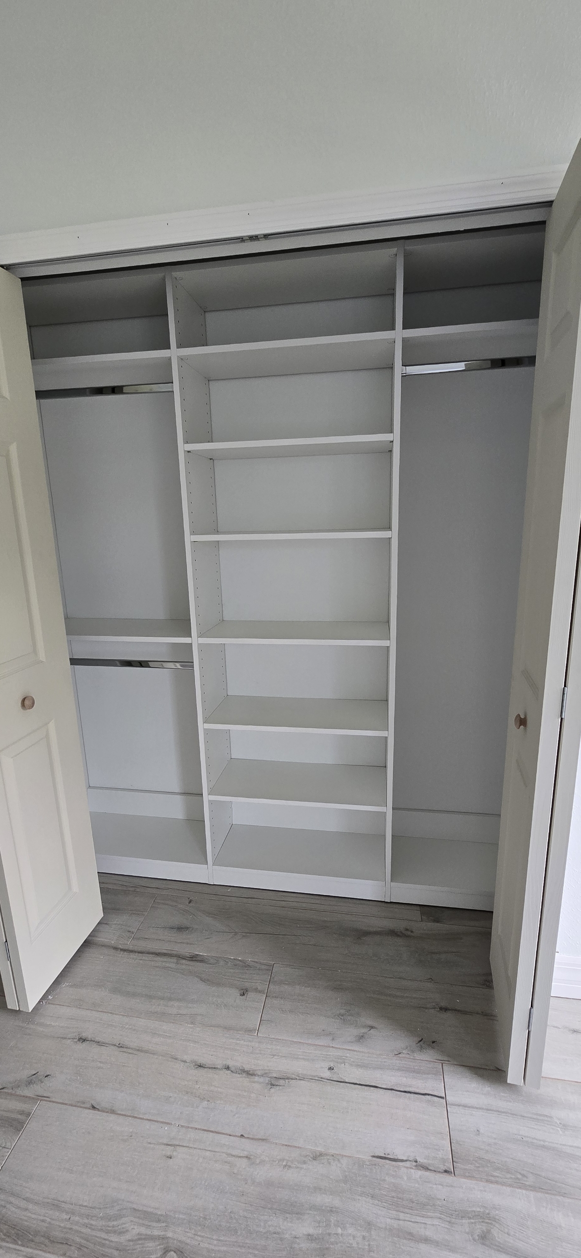 Melamine closets are durable and an upgrade to your existing space. The new tie racks, hamper baskets, and spacious shoe racks provide additional storage for your convenience.